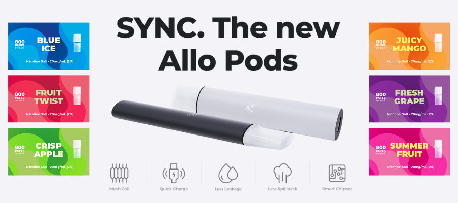 The Allo Sync device utilises Allo Sync prefilled pods, which are available separately in packs of two in 6 different flavours. The device comes with 3 pods included (please see above for flavours). The pods themselves are designed to deliver extra flavour with their built-in mesh coils, which are kept separate from the liquid in transit to ensure a perfectly leak-free experience every time. When you open a new pod, simply press the seal on the base of the pod inward, wait five seconds, then insert the pod into the device. You’re ready to vape!