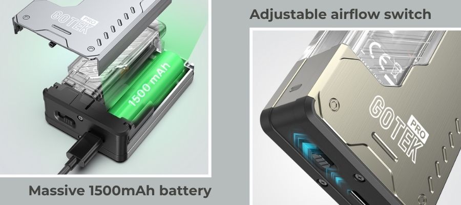 The Aspire Gotek Pro Pod Kit is a state-of-the-art pod vape designed for MTL & RDL vapers. Its massive 1500mAh battery should last most users up to 2 days, perfect for those on the go. This beginner-friendly vape features draw activation, adjustable airflow, and a no-button interface, making it an ideal starter kit. The device uses convenient pods with built-in coils for hassle-free maintenance.