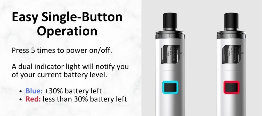 The kit is small and highly portable, with handy features like an E-Liquid sight window and a single large button for operation. The vape also features a wide, comfortable drip tip mouthpiece to evoke the feeling of a cigarette without limiting your airflow.