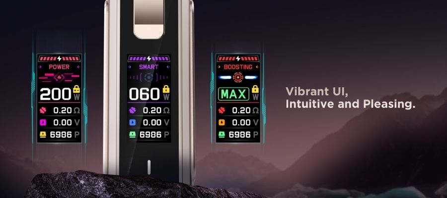 The user interface includes a vibrant 0.96" TFT colour display which shows essential vaping data like your current coil resistance, voltage, wattage, battery level, and puff count. The clickable fire button and the two touch-activated buttons below the screen allow for easy adjustments.