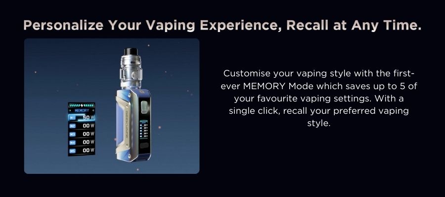 Memory mode is the first-ever vape mode that allows you to save up to 5 of your favourite vaping settings, so you can swap between them at any time.