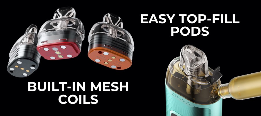The kit includes two top-fill OXVA VPrime pods with a 2ml e-liquid capacity and built-in mesh coils. The integrated mesh coils deliver denser flavour and vapour production, and the pods are easy to replace when needed.