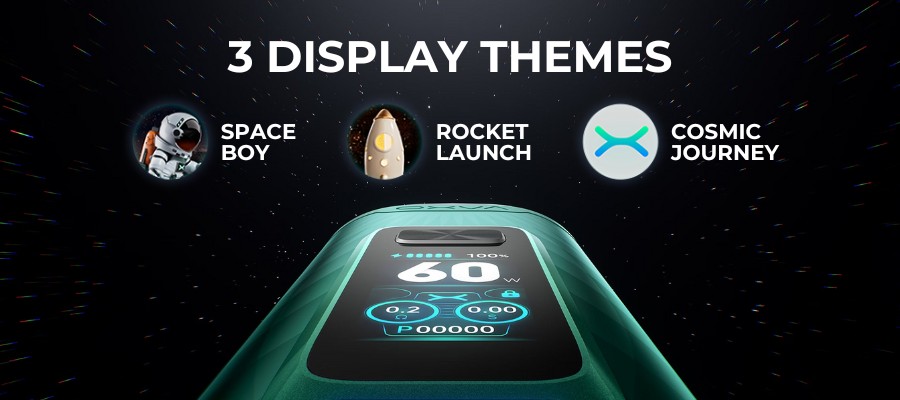 Its user-friendly 0.96-inch colour display shows essential settings such as battery life, wattage, and mode. Users can select from three unique 3D themes to personalise their vaping experience.