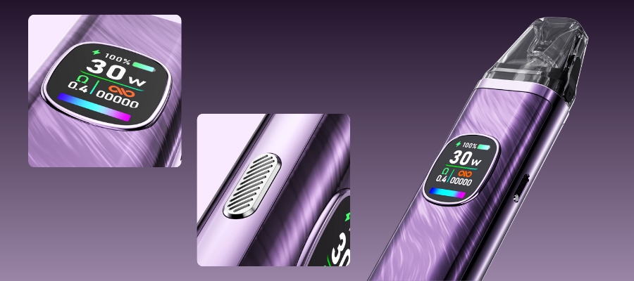 The kit is equipped with a power button which helps you tailor the adjustable wattage settings from 5W to 30W, allowing you to fine-tune your vape to suit your preference. A standout feature is the 0.56-inch Ultra-HD colour display, which boasts 200% higher pixel density than standard screens, offering clear and vibrant visuals for easy adjustments and real-time monitoring of your settings.