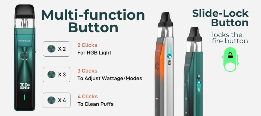 For all other XROS pods, it offers Eco, Normal, and Power modes. The button allows you to fire the vape, clear the puff counter, adjust wattage/modes, and control the RGB light.
