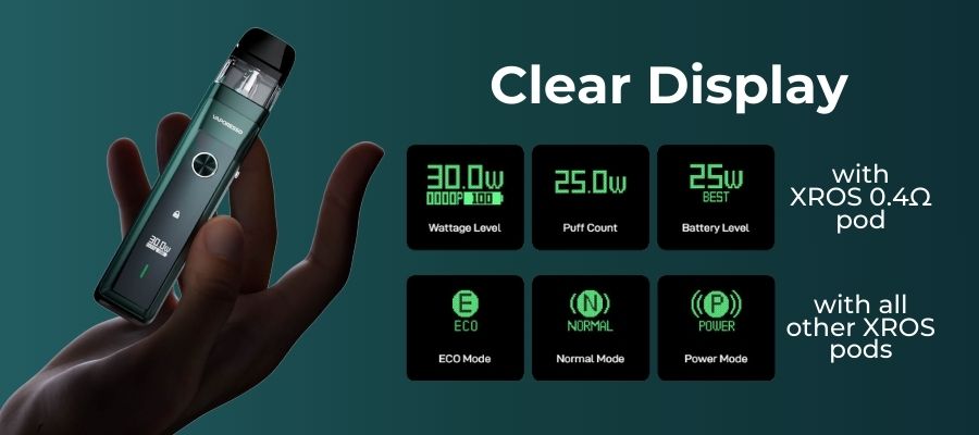 The device features the first-ever screen in the Vaporesso XROS series, displaying the wattage, puff count, and battery level, with adjustable wattage in 0.5W increments for the 0.4Ω (ohm) pod.