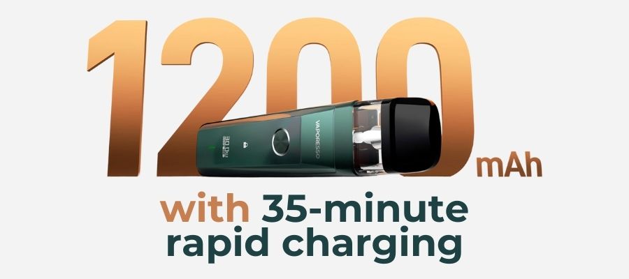 As for its battery, the kit houses a built-in 1200mAh battery that supports USB-C fast charging (2A) in just 35 minutes, ensuring you're never long without your vape. A charging cable is included with the kit.
